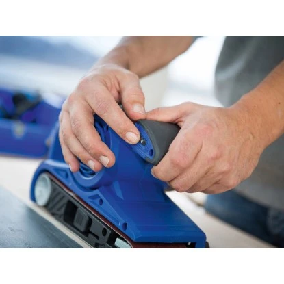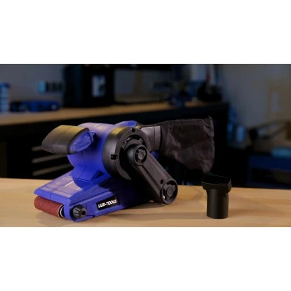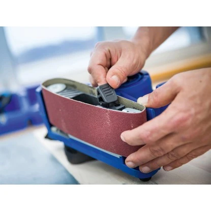 Ein praktischer Staubauffangsack ermöglicht das Sammeln des Abriebstaubes, bevor er sich im Arbeitsumfeld verteilen kann. Alternativ ist es möglich, mittels mitgeliefertem Adapter einen Staubsauger anzuschließen, sodass der Abrieb direkt entfernt wird. Der verwendete Werkstoff sowie die Arbeitsfläche bleiben sauber, was besonders beim Arbeiten in Innenräumen hilfreich ist, Zeit spart und den Komfort erhöht. Das Schleifband lässt sich ohne Einsatz von zusätzlichem Werkzeug mühelos auswechseln.