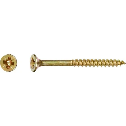 Der PZ-Antrieb ähnelt im Aufbau dem PH-Antrieb (Kreuz) und verfügt über eine zusätzliche kreuzförmige Einkerbung. Durch diese wird dem Antriebswerkzeug ein zusätzlicher Halt gegeben, dadurch ist dieser Antrieb dem PH-Antrieb in Bezug auf seitliches Verrutschen und der Kraftübertragung leicht überlegen. Die gelb verzinkte Spanplattenschraube & Universalschraube verfügt über einen deutlich besseren Korrosionsschutz als blanker Stahl. Aber nicht nur der Schutz vor äußeren Einflüssen ist deutlich besser, sondern auch die Optik wird aufgewertet. Der Senkkopf ermöglicht eine flächenbündige Versenkung im Werkstoff. Dadurch werden scharfe Kanten im Material verhindert und das Verletzungsrisiko verringert. Zudem lässt sich der Schraubenkopf einfach verputzen, sodass dieser nicht mehr sichtbar ist.